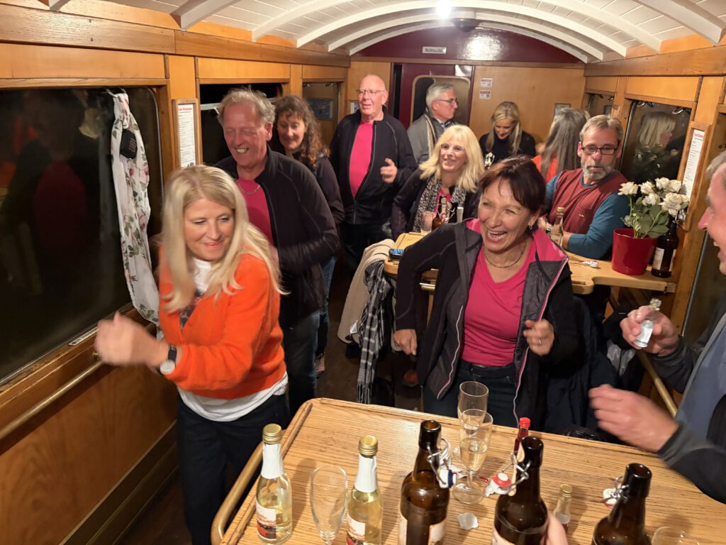 diesmal im Restaurantwagen, der kurzerhand zum Tanzwagen umfunktioniert wurde. Bei Musik, Tanz und ausgelassener Stimmung verging die Zeit wie im Flug. Zurück ins Hotel gönnten wir uns diesmal noch eine Zugfahrt (NATÜRLICH mir gültigem Fahrschein 😉 )