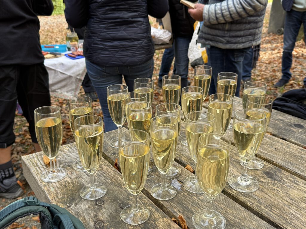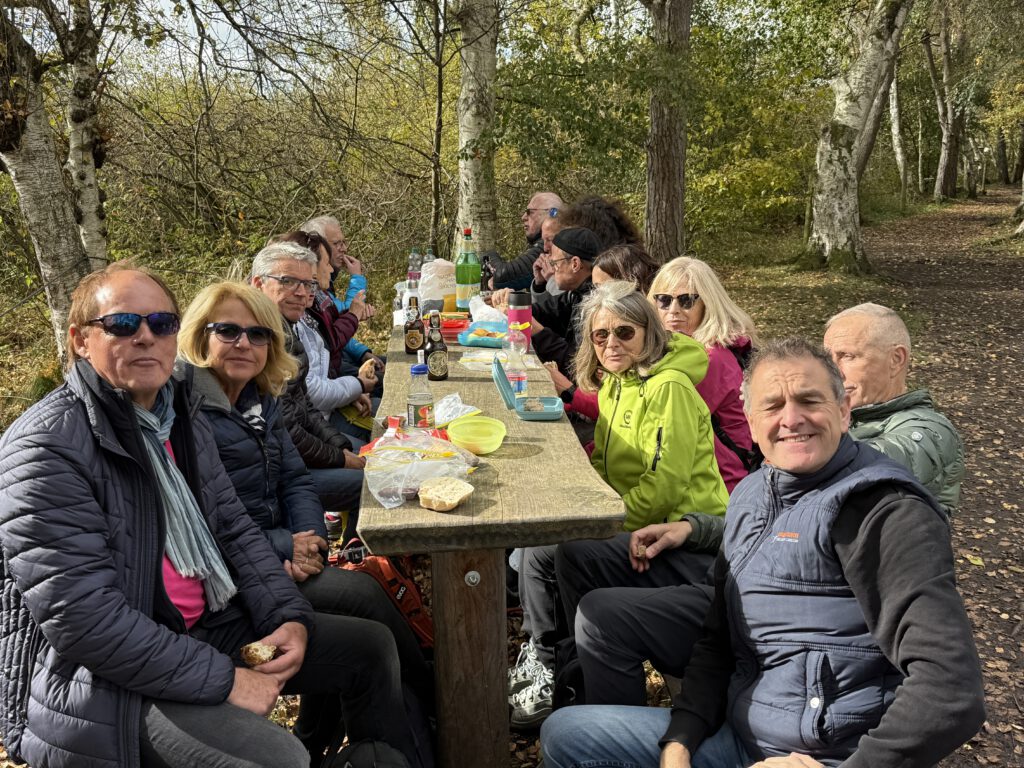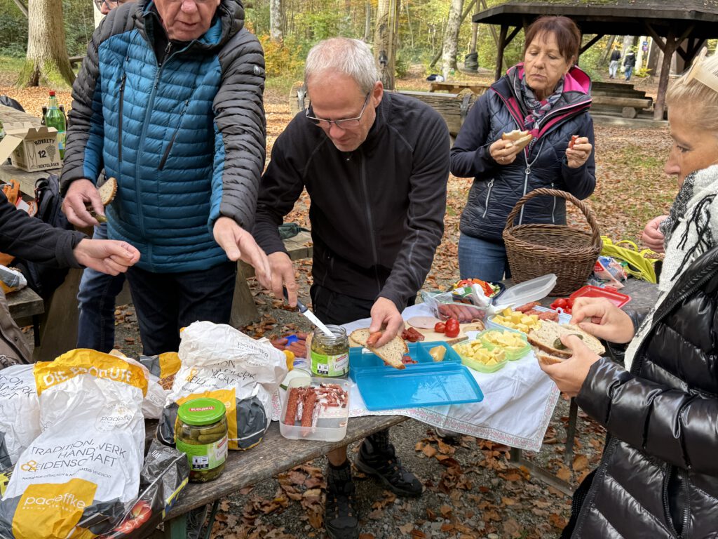 Nachdem nun fast jeder ein „Hüngerchen“ verspürte, wurden die prall gefüllten Rucksäcke ausgepackt und erneut ein kräftigendes Vesper auf den Tisch gezaubert, begleitet von einem Gläschen Sekt und/oder einem kühlen Bier. Jetzt waren alle Tanks voll und der Marsch konnte beginnen.