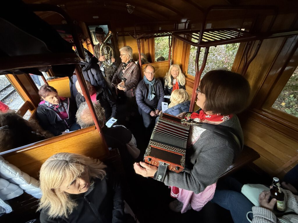 Für beste Unterhaltung an Bord sorgte eine dreiköpfige Liveband, die mit schwungvoller Musik wie z.B. des Klassikers „Auf dr schwäbsche Eisebahne“, der natürlich perfekt zur Stimmung und zum Anlass passte, die nostalgische Zugfahrt begleitete.