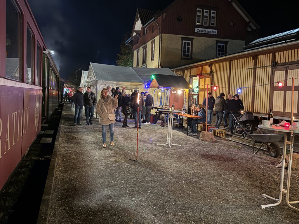 Der festlich beleuchtete Bahnhof in Ochsenhausen bildete den stimmungsvollen Rahmen für einen Halt mit herzhaftem Gulascheintopf,